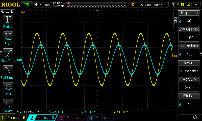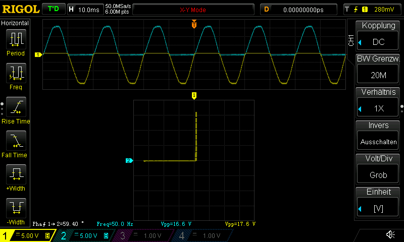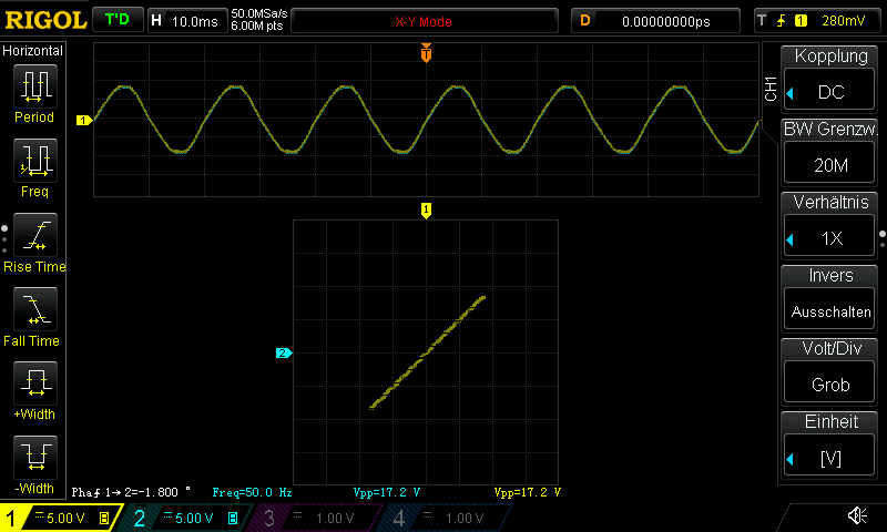 Allerdings ist die Phasenmessung bei analogen Oszilloskopen schwierig, da das Raster in x-Richtung nur sehr grob ist. DSOs sind da komfortabler, da man sich die Phasendifferenz zweier Signale direkt in Grad auf dem Bildschirm anzeigen lassen kann.