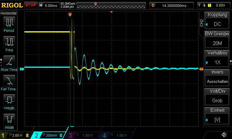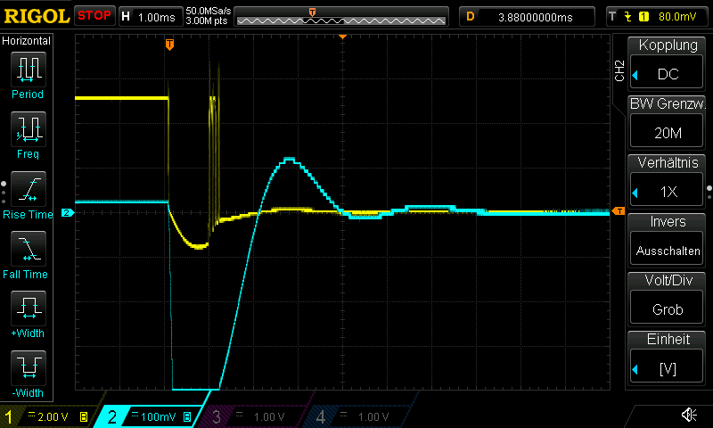 Dies geschieht am Besten durch abziehen des Bananensteckers vom Labornetzteil. Dabei kann es zu Prellen kommen, was auch auf dem Display des DSOs sichtbar wird.