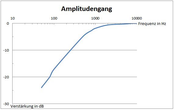 Die Amplitude wird als relative Größe auf das Eingangssignal bezogen (-> Verstärkung bzw. Dämpfung) und in dB aufgetragen. Die Umrechnung erfolgt mit 20*log(U
