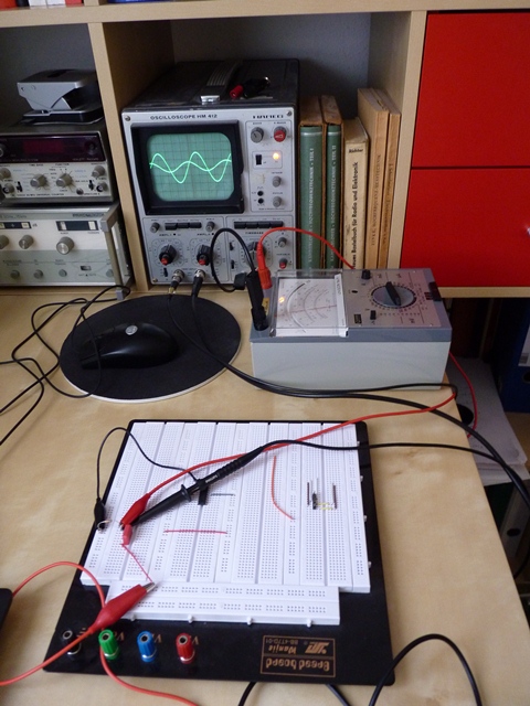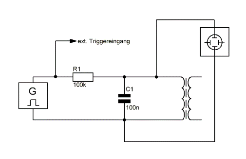 mit einem Kanal des Oszis angezeigt. Was im Schaltbild fehlt, ist die Verbindung des Generatorausgangs mit dem zweiten
