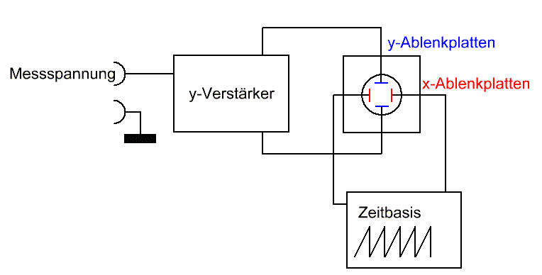 In der Skizze oben sind die wichtigsten Bestandteile eines 1-Kanal Oszilloskops vereinfacht dargestellt.