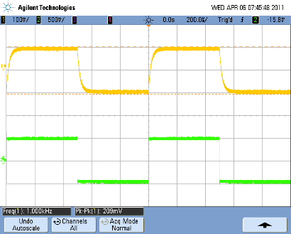 Deshalb verwenden wir zum Anregen ein PWM-Signal mit ca 10Hz und einem Puls-Pausen-Verhältnis von 10:1.