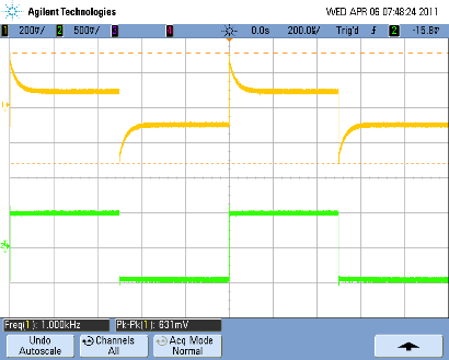 Das gelbe Rechteck ist vom falsch eingestellten Tastkopf und das grüne Rechteck von einem korrekt kompensierten. Durch die Verwendung eines Tastkopfes wird auch die kapazitive Belastung der Quelle durch den Eingang des y-Verstärkers reduziert.