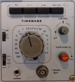 In der Mitte der Zeitbasis befindet sich der Drehschalter, an dem die Zeitablenkung eingestellt wird. Je nach Frequenz und der Anzahl von Schwingungen,