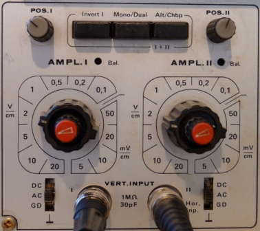 Der Y-Verstärker dient zur Aufbereitung des Messsignals. An einem Drehschalter lässt sich für jeden Kanal die Bildschirmunterteilung/Messskala einstellen,