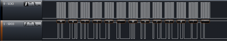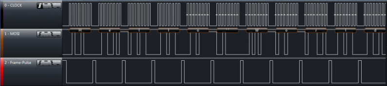 Auch das zweite Beispiel sendet im Mastermode einen String "Hello World!" über den Datenausgang des SPI-Moduls. Diesmal ist allerdings zusätzlich der Frame-Pulse aktiviert. In diesem Modus werden auf einem Ausgangs-Pin synchron zur Übertragung kurze High-Impulse ausgegeben. Deren Abstand und Länge kann unterschiedlich konfiguriert werden. Auch Low-Impulse sind einstellbar. Über diese Frame-Impulse lassen sich ICs mit einem Latch-Pin ansteuern (z.B. Schieberegister, DAC, etc.). Dafür wurde nur der Konfigurationswerte im SPI3CON-Register geändert.