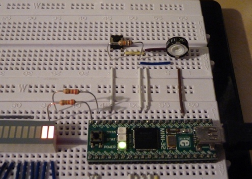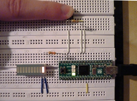 Als nächstes verwenden wir den Analog-Digital-Wandler (ADC). Unser PIC32 enthält einen 10Bit-Wandler mit einer maximalen Abtastrate von 1Msps (Megasample per second), der mit Sukzessiver Approximation arbeitet. Um verschiedene Spannungen an den ADC-Eingang anlegen zu können, um damit unser Program zu testen, brauchen wir noch ein Potentiometer, das wir zwischen Masse und +3,3V schalten.