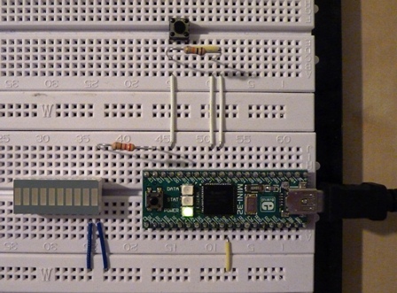 Jetzt funktioniert das Toggeln der LED wie gedacht. Allerdings vertrötteln wir im Moment noch einen Haufen Zeit in der Warteschleife und beim Pollen der Taste. Da gibt es aber auch einen eleganteren Weg.